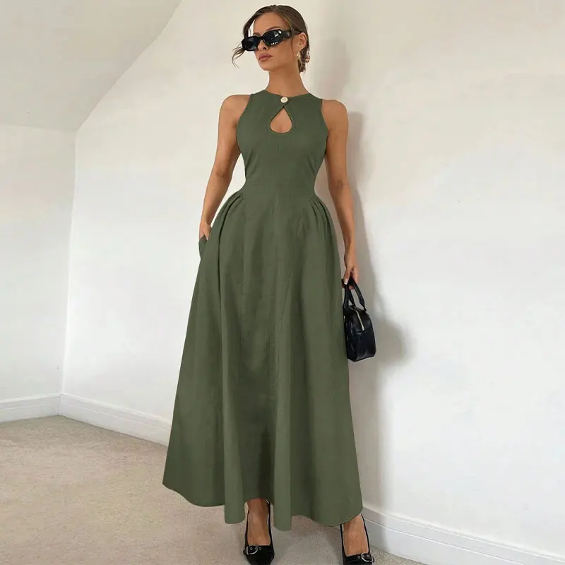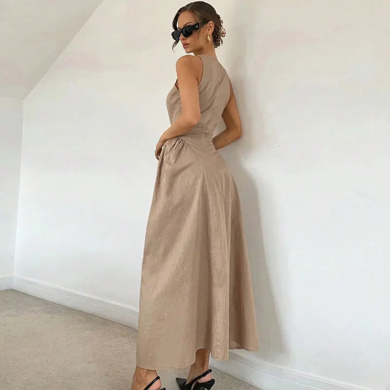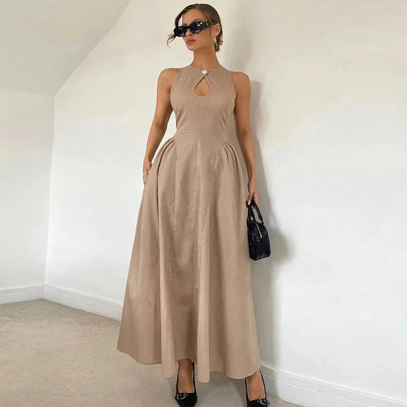Huili Manufacturer 2025 Women's Custom Maxi Linen High Quality Fashion Casual Sleeveless Boho Flare Hem Solid Color Floor-Length